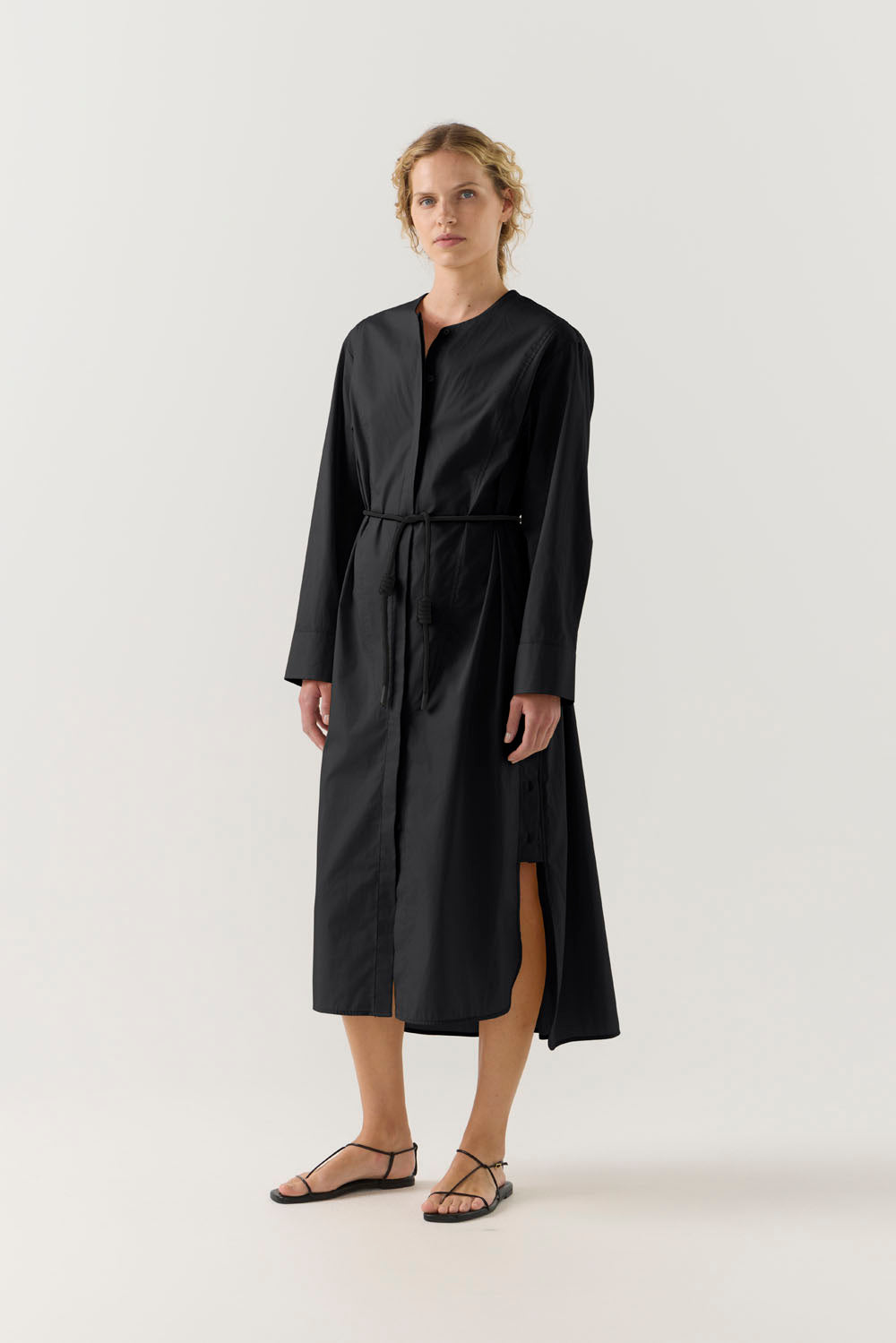 A contemporary take on utilitarian dressing, the Celine Dress features clean lines and considered detailing. The minimalist silhouette is grounded by a deep round bib with a concealed placket, while a gently curved high-low hem and side splits with functioning plackets allow for ease and versatility. Cut from crisp cotton poplin, the long sleeves are finished with extended plackets for adjustable styling. Designed to be worn with or without the optional belt, this style moves effortlessly between refined and relaxed. Feather Belt in Black sold separately.