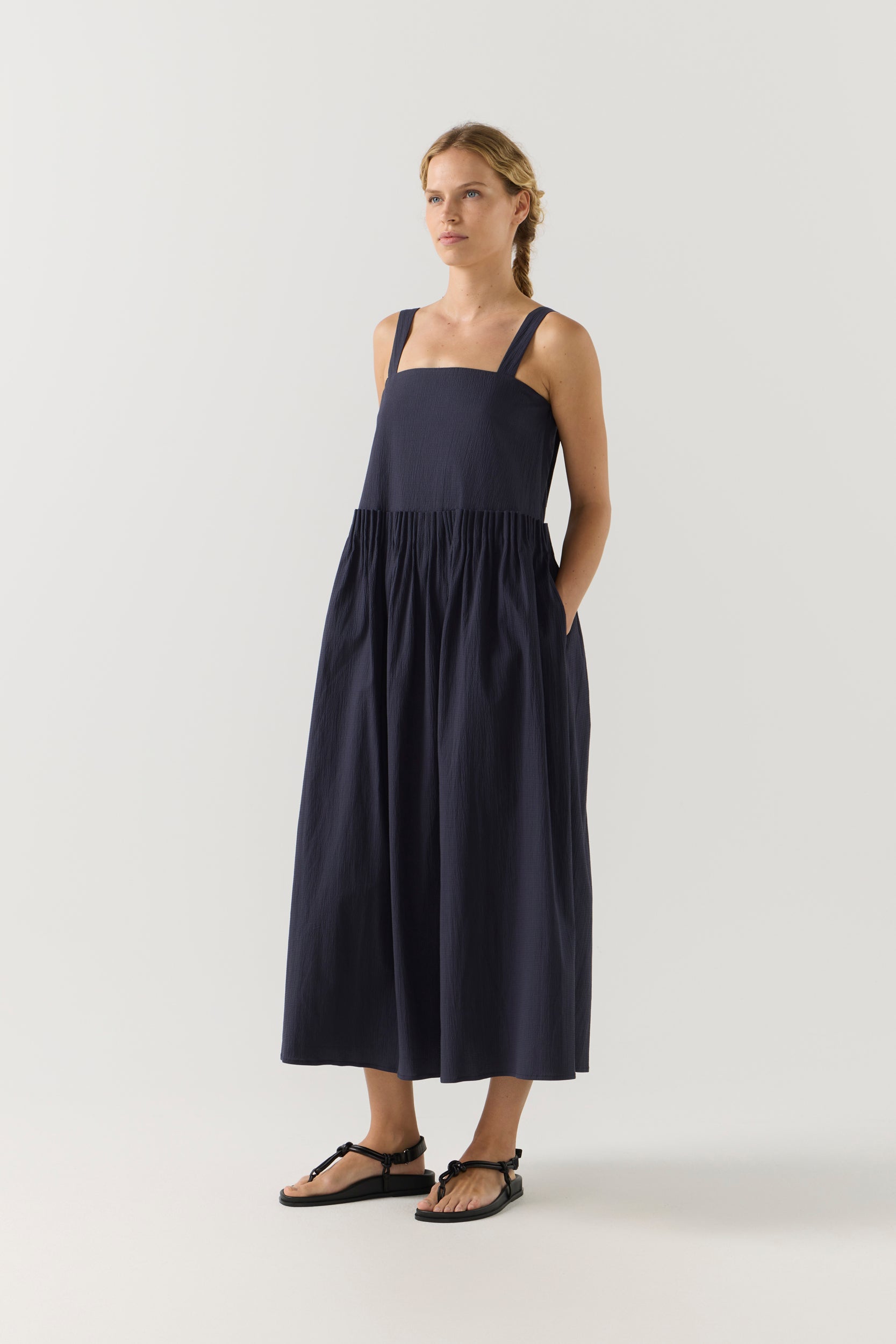 An effortless study in volume and versatility, the Cordelia Dress is crafted from cotton seersucker and features origami like pleating that falls from a bandeau neckline. Designed to be worn with or without the adjustable tie straps, this piece shifts seamlessly from minimal to romantic, offering styling flexibility with its clean lines and relaxed silhouette.