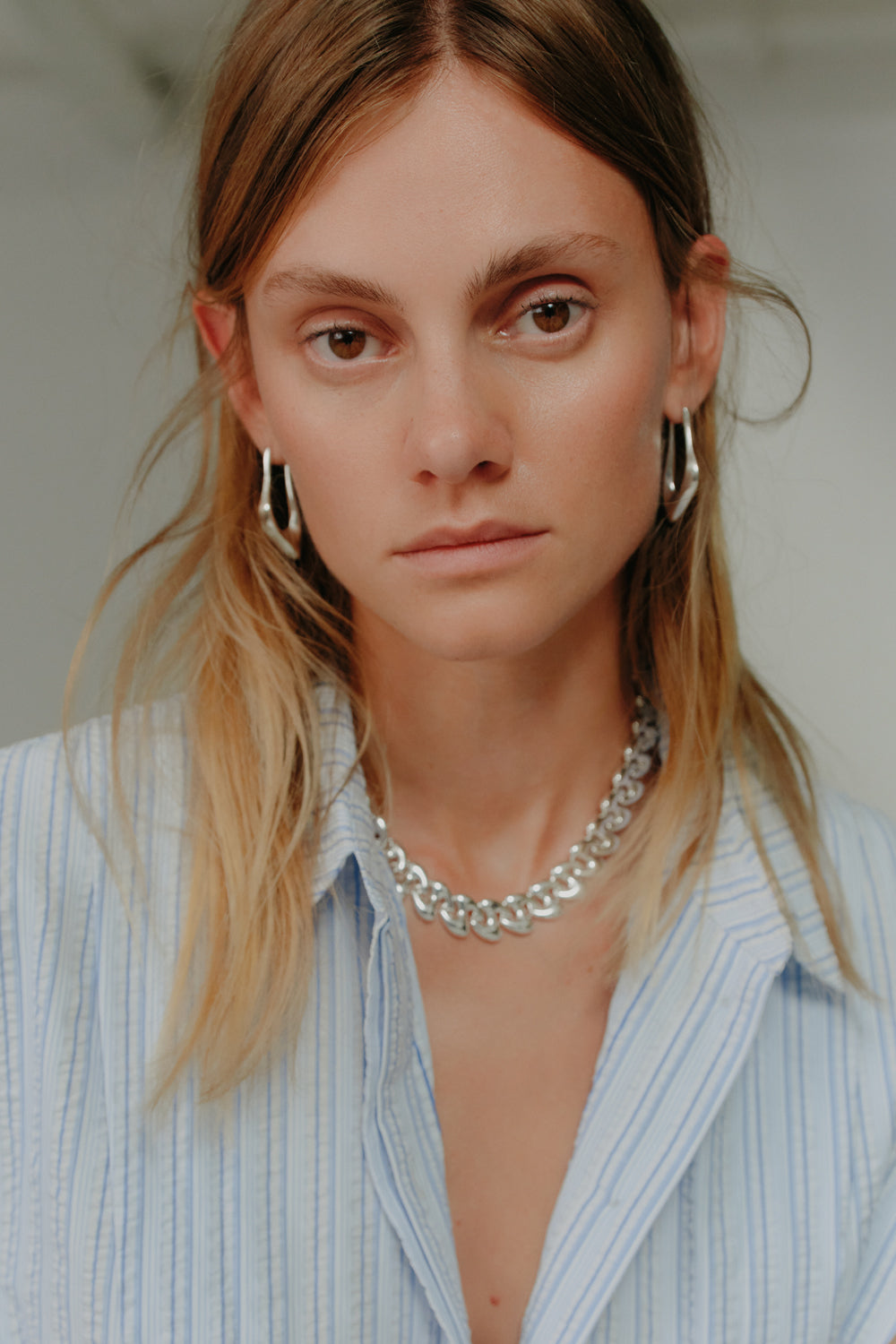 An elevated take on the shirt dress, this style is defined by its clean lines and subtle detailing. Cut to a midi length in a crisp blue pinstripe, it features a concealed placket for a streamlined finish. Pleats fall softly from the shoulder, opening into the skirt to create gentle volume and movement. A knotted rouleau belt cinches the waist, offering shape while maintaining an effortless feel.