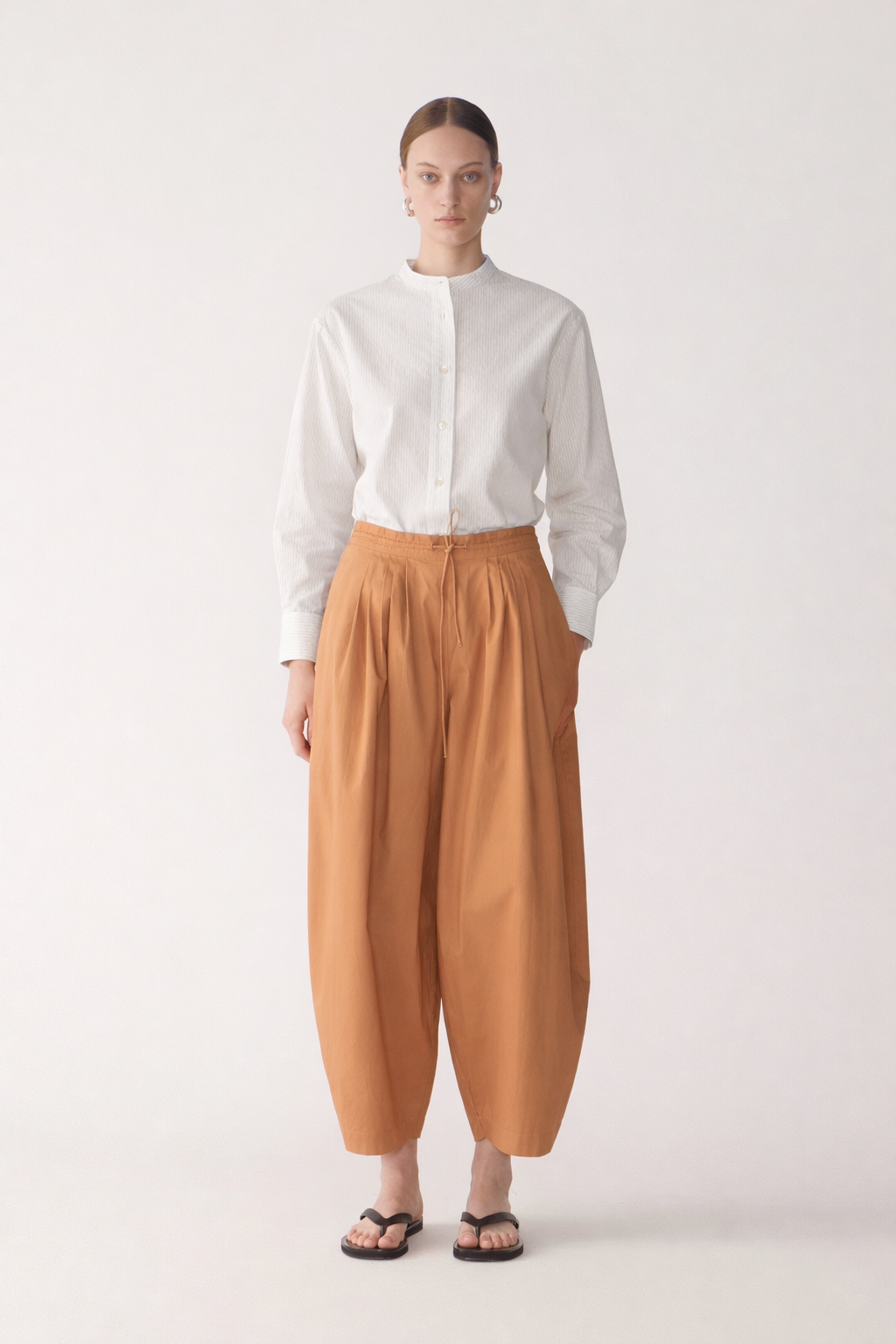 These pants balance relaxed volume with considered structure. Crafted from crisp organic cotton poplin, they feature an elasticated back waistband with a fine rouleau drawcord for an adjustable fit. Soft pleats fall from the waistband to form a sculptural barrel leg shape, while discreet side seam pockets add everyday functionality. An effortless silhouette defined by clean lines and modern ease.