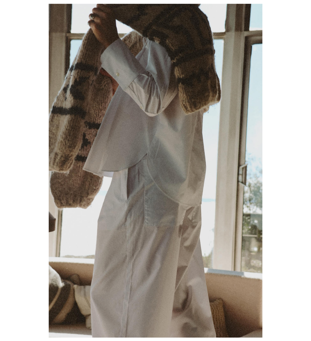 Phoebe wears the Jade Shirt in White and the Skye Pant in White.