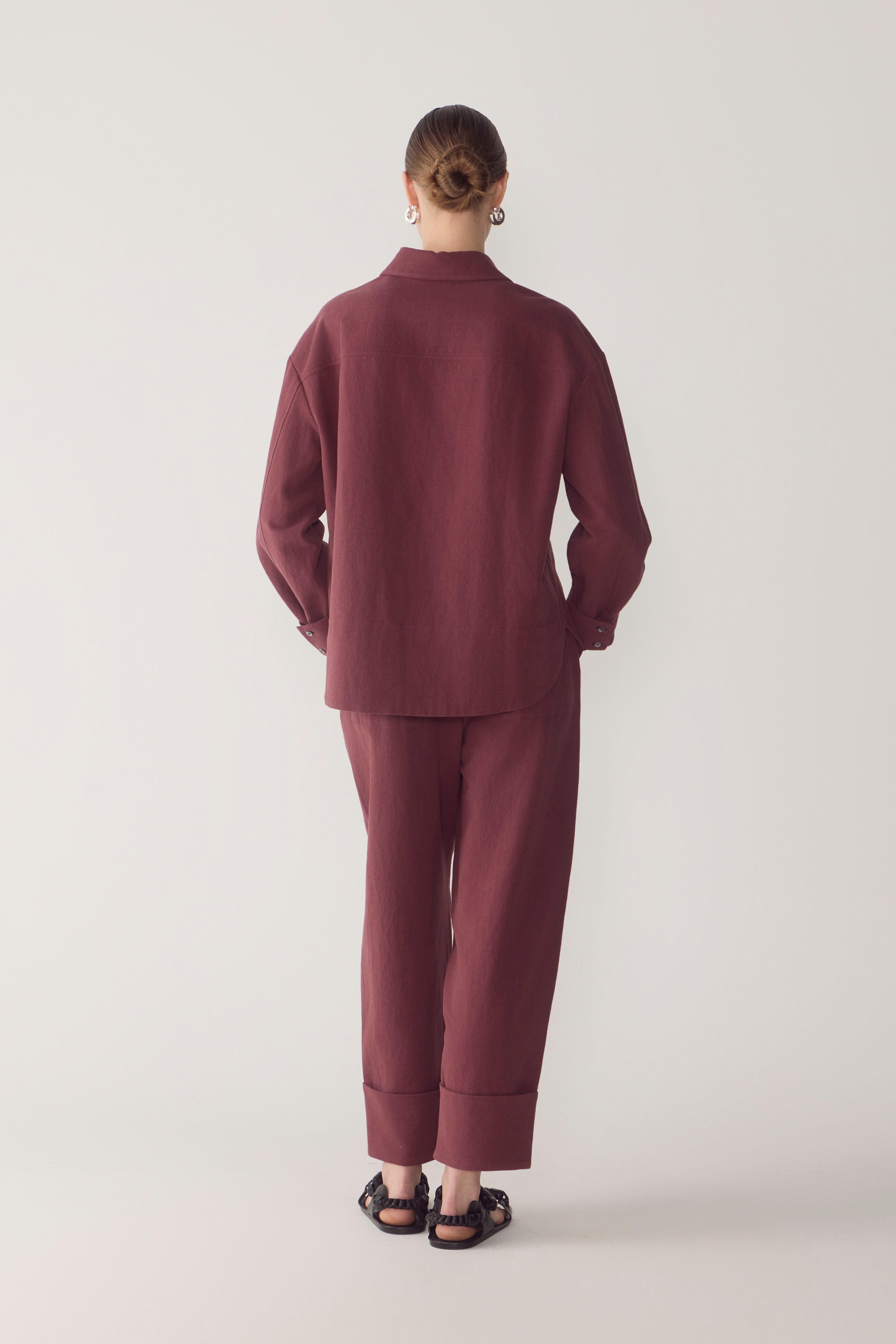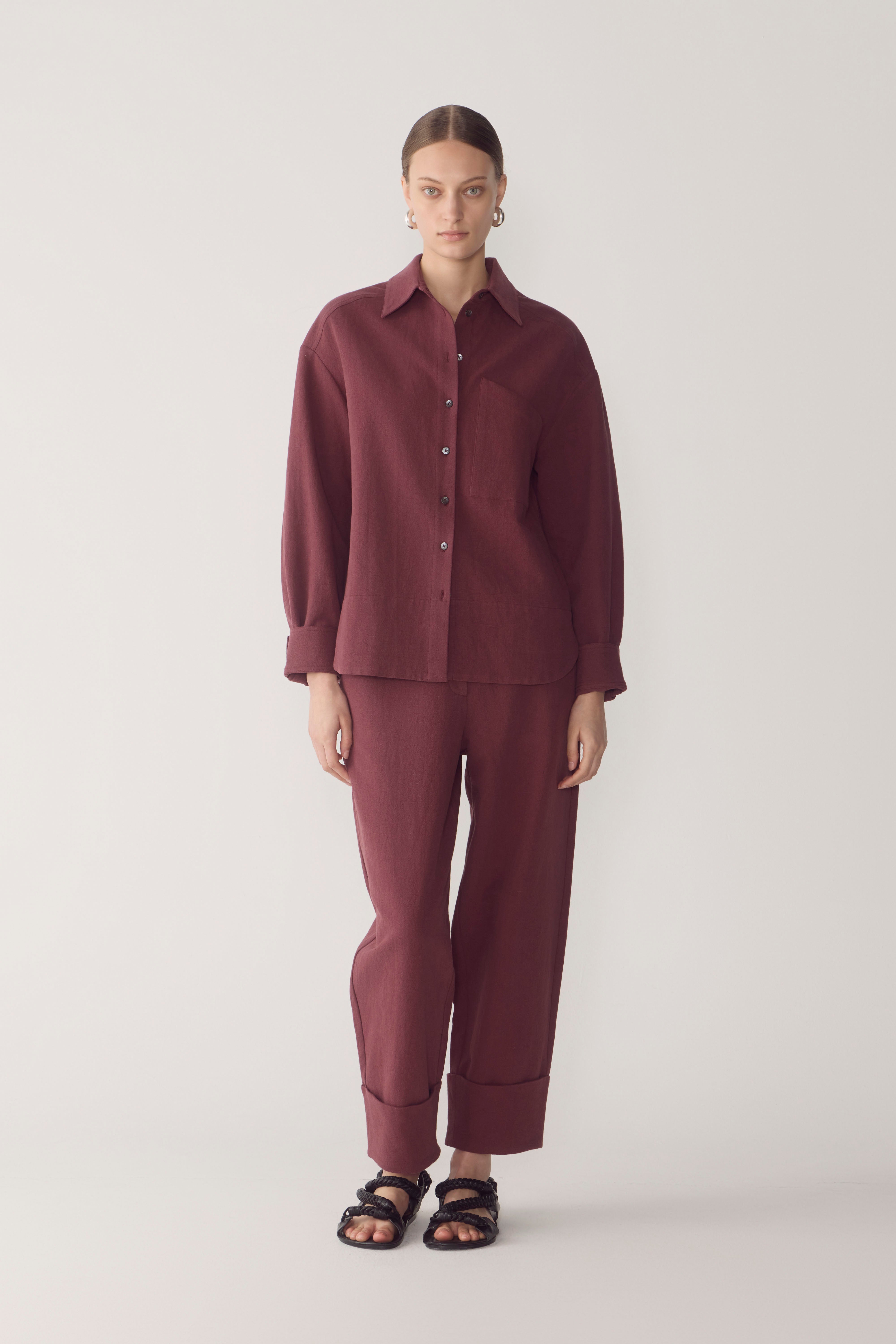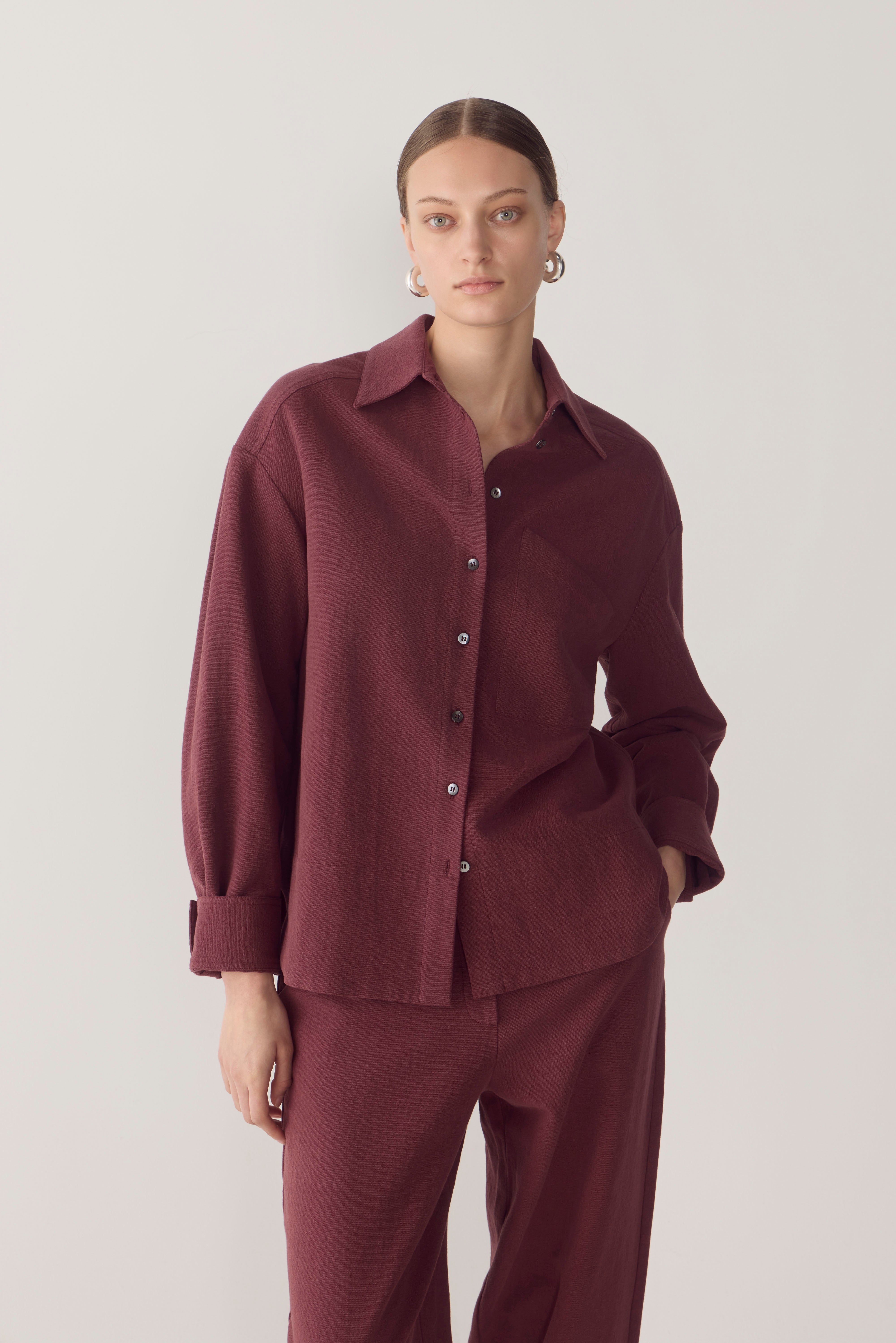 This cotton linen shirt combines relaxed comfort with thoughtful design details. Featuring side splits for ease of movement and a turned cuff for a refined touch, it effortlessly balances laid-back style with structure. The angled front patch pocket adds a unique, asymmetrical twist, while intricate seam detailing elevates the design with subtle texture, making this shirt a standout piece. Worn with the Blair Pant in Mulberry.