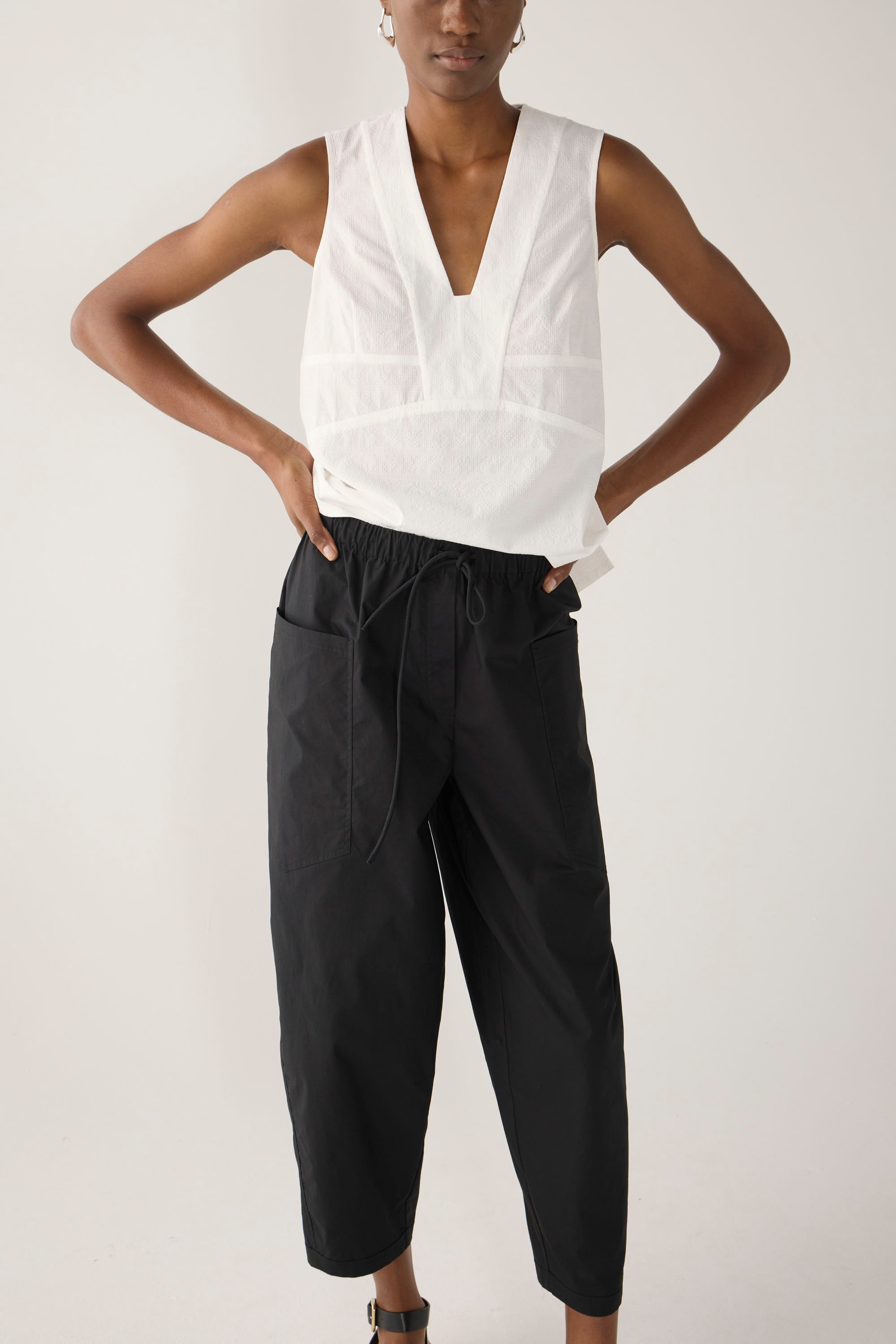 These pants feature an elasticated waistband with a cord tie, creating an easy, adjustable fit. The tapered cropped leg gives a modern silhouette, while the side pouch pockets add both functionality and a utilitarian edge. Crafted from a structured yet lightweight organic poplin, they balance comfort and polish - perfect for everyday wear with a minimalist sensibility.