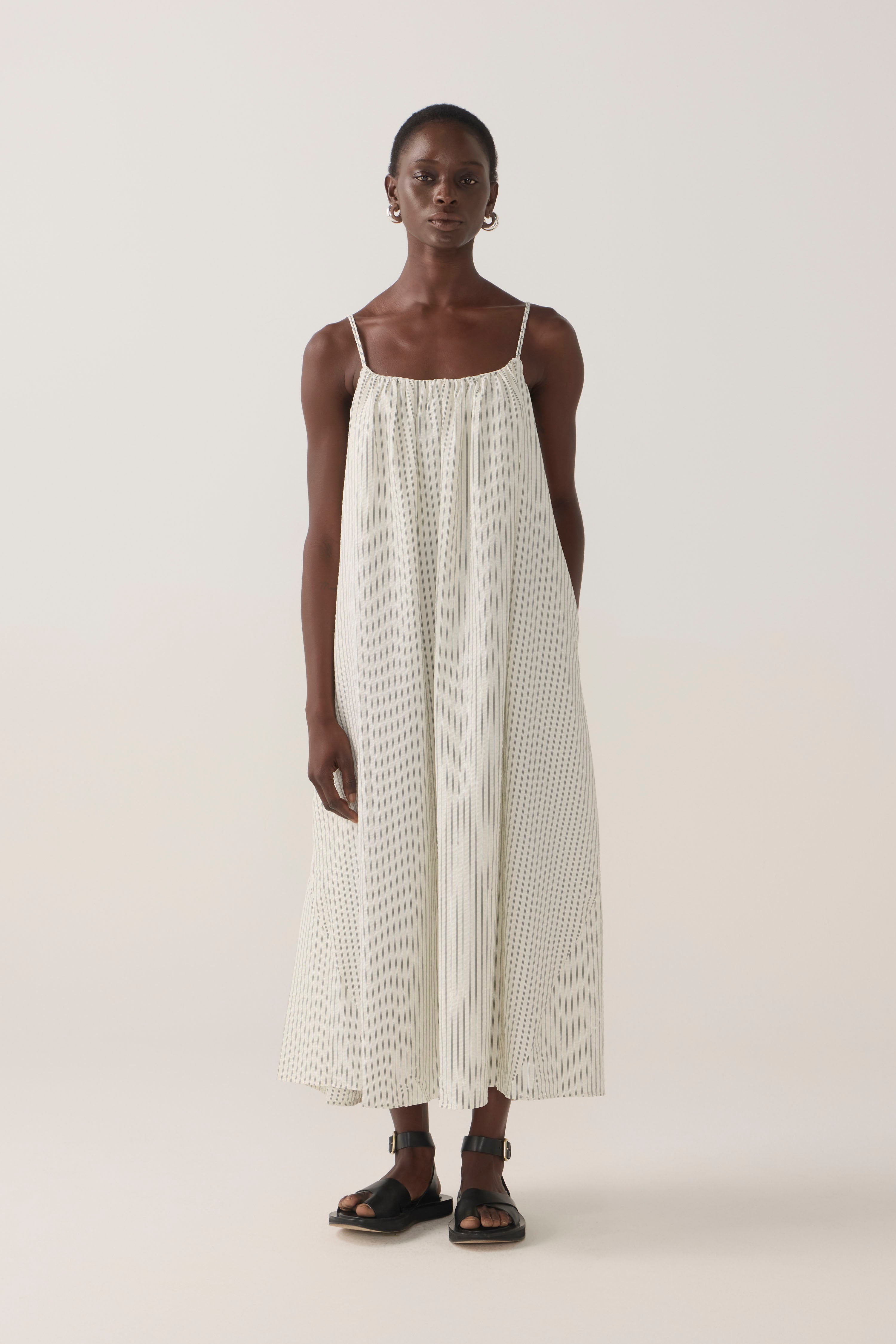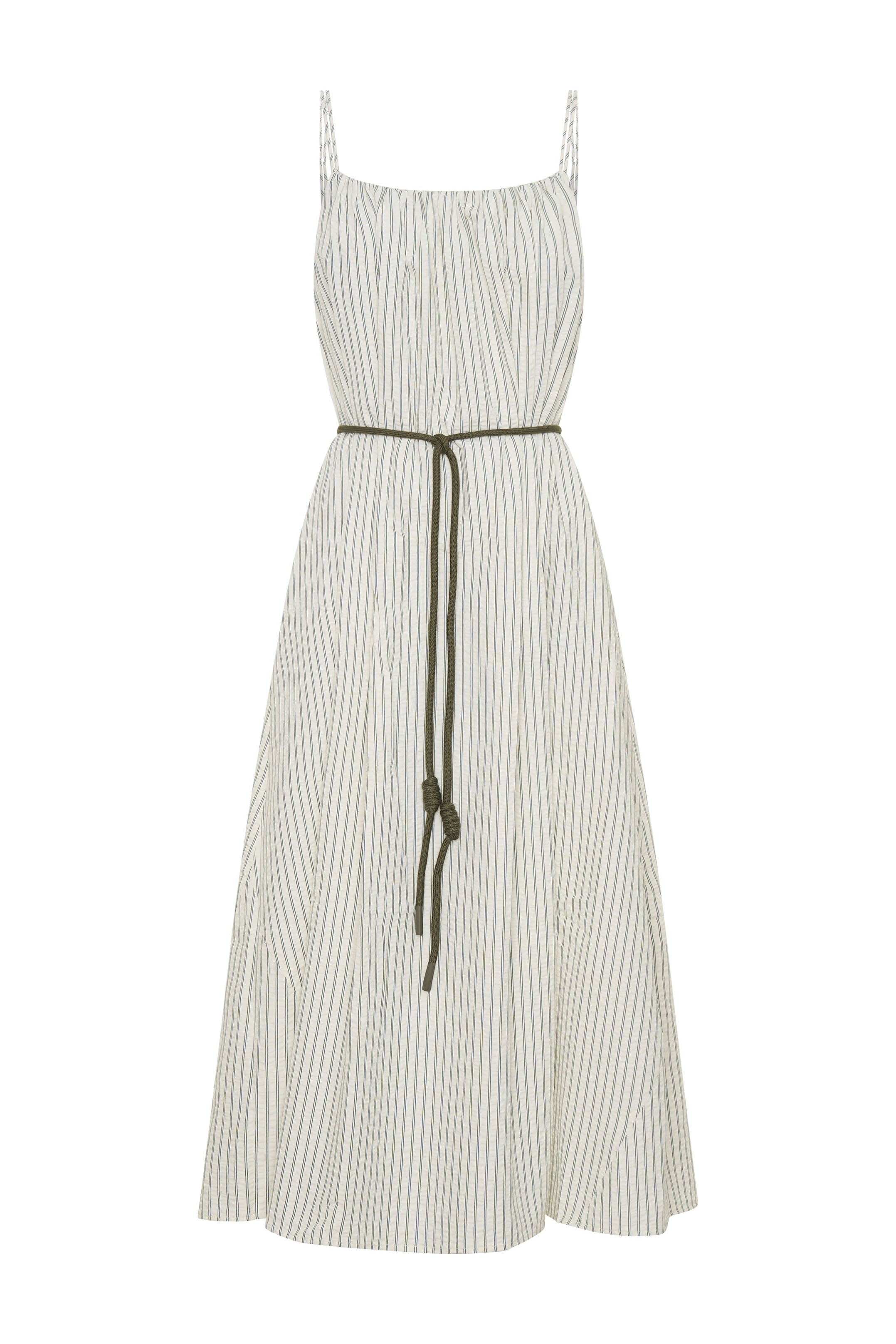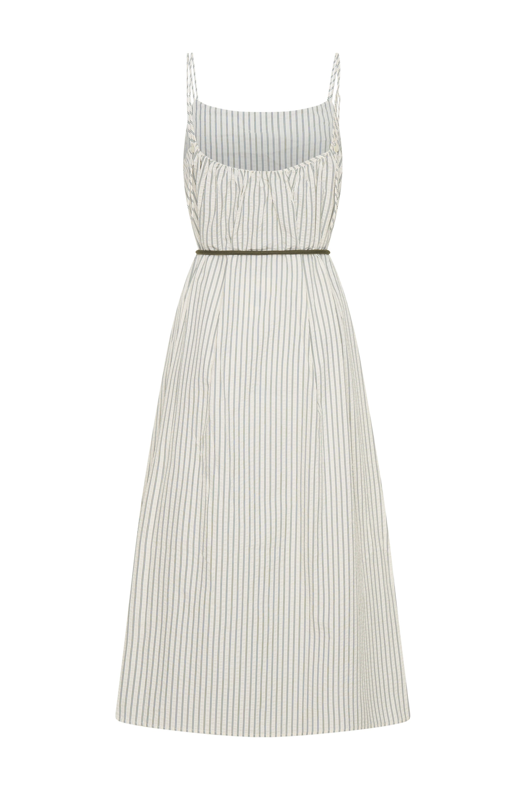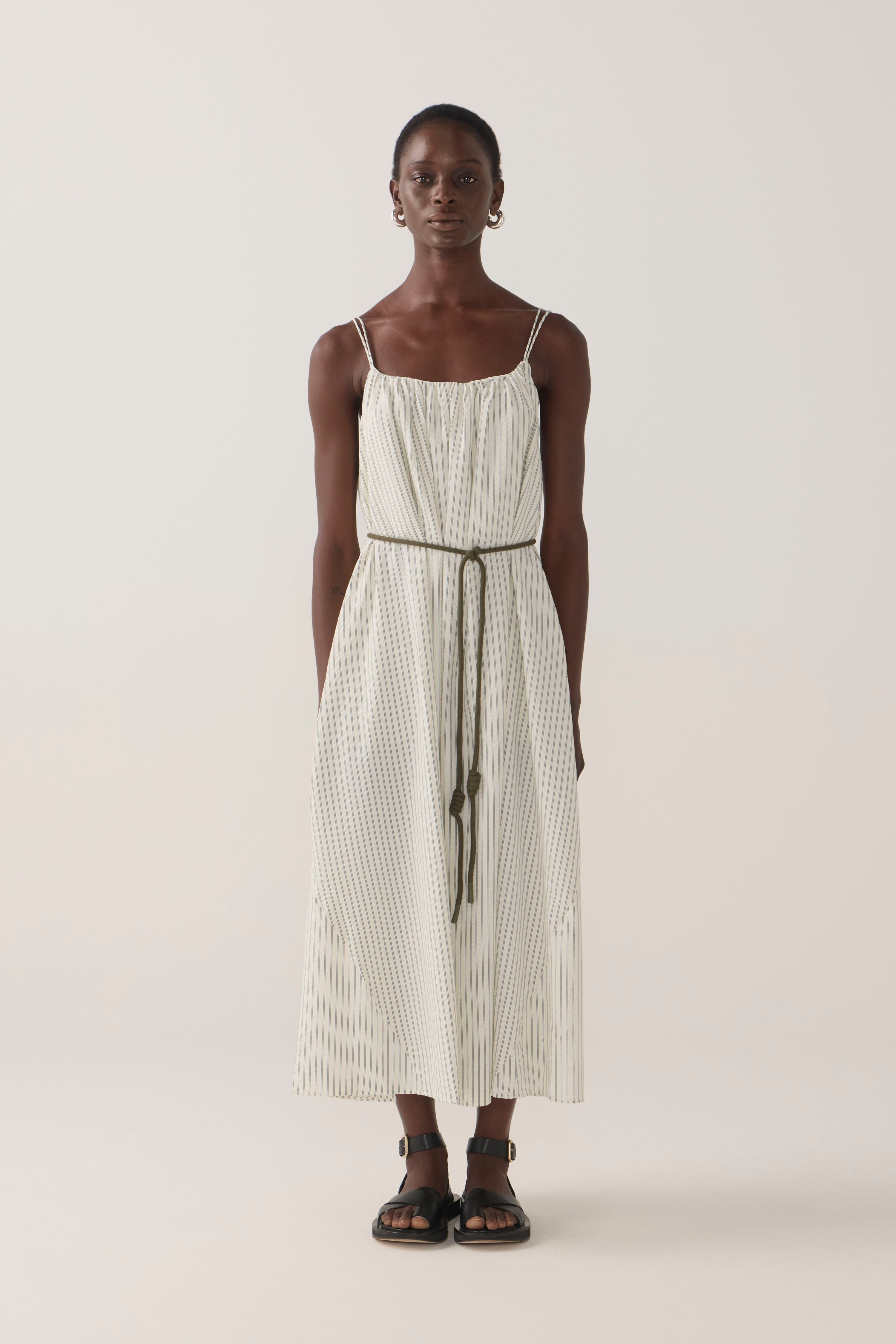 A breezy silhouette defined by considered detailing, the Maddie Dress features delicate gathers at the neckline and adjustable straps secured with buttons. The hem is accented with subtle triangle inserts, adding volume and movement. Designed with ease in mind, it includes discreet side seam pockets and pairs effortlessly with the collection’s separate belt for a cinched silhouette. Feather Belt in Basil sold separately.