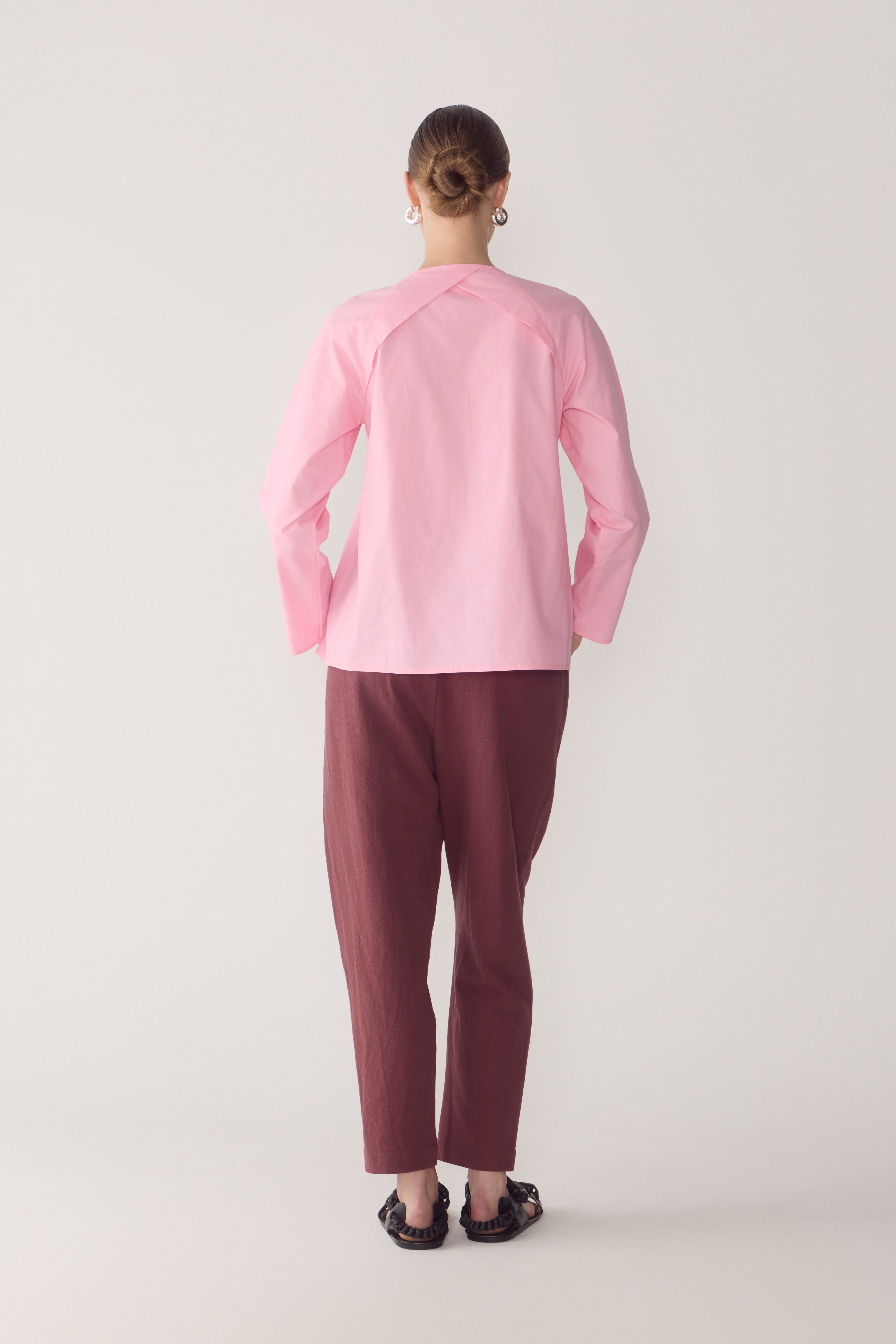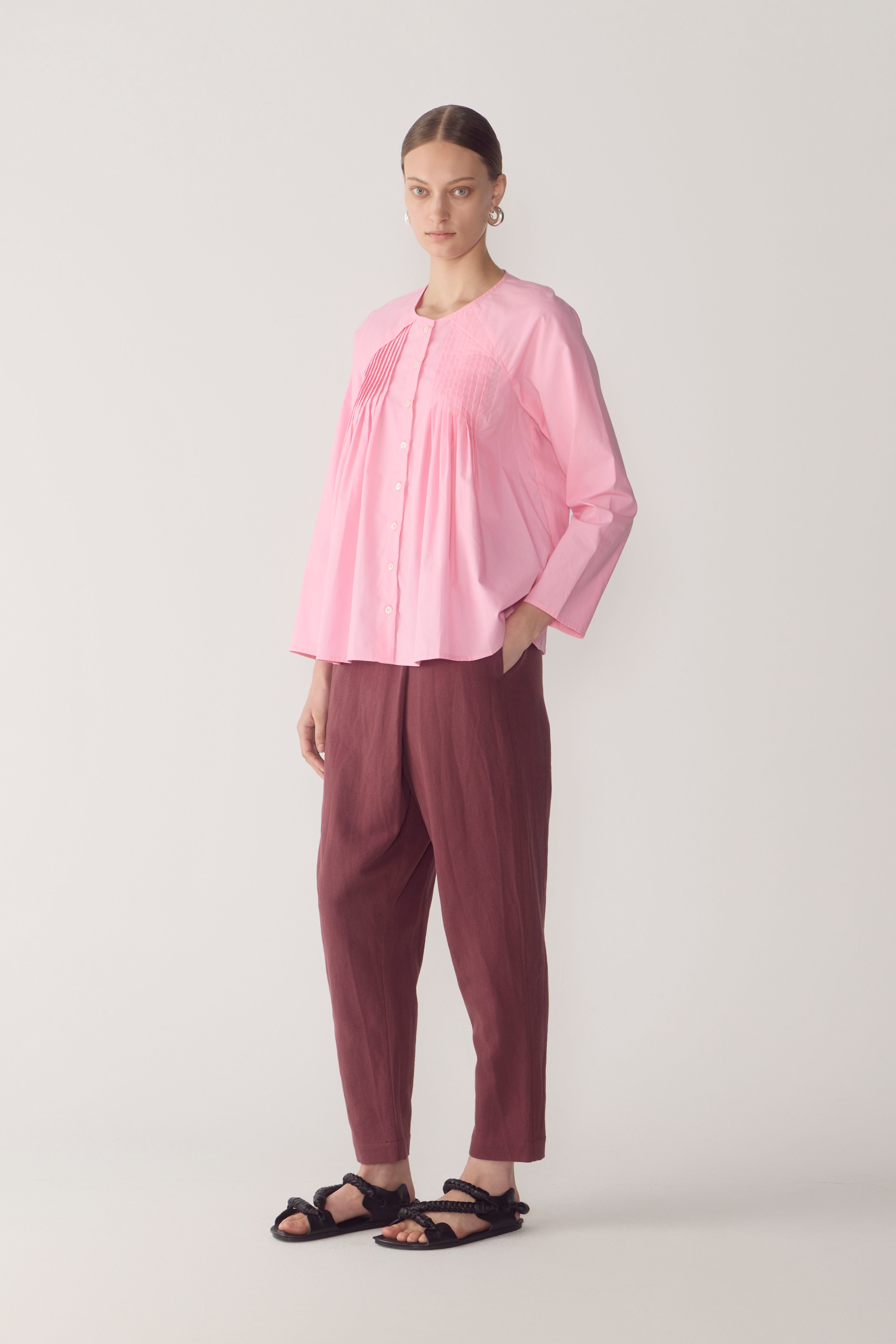 This top balances soft structure with fluid ease, defined by its clean round neckline and full button-through front. Cut with a raglan sleeve, fine pintuck detailing extends from the shoulder seam and gently releases through the body, creating subtle volume that falls naturally toward the hem. The silhouette is relaxed yet considered, offering movement without excess, while long, streamlined sleeves maintain a quiet, architectural line.