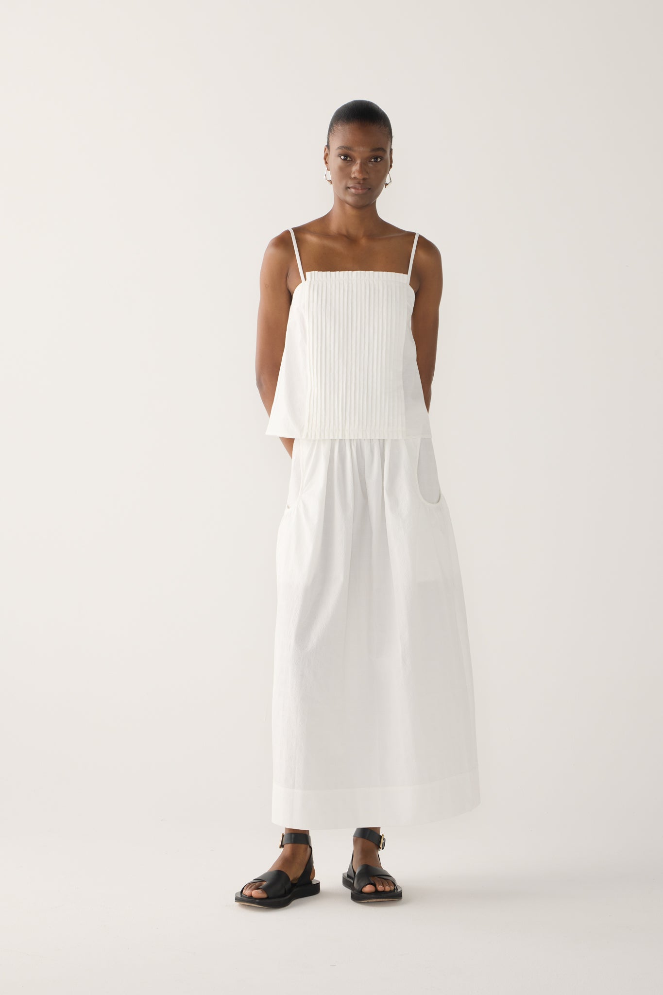 Crisp and refined, this top is made from organic cotton poplin and features delicate adjustable straps and a neatly pleated bodice that creates a sense of quiet sophistication. The minimalist square neckline and straight fit offer a contemporary balance of polish and ease. An elevated wardrobe staple designed to move seamlessly between day and evening.